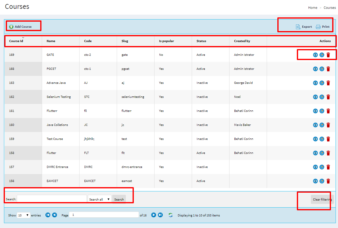 Admin can view all course list and he is liable to modify/delete the courses.