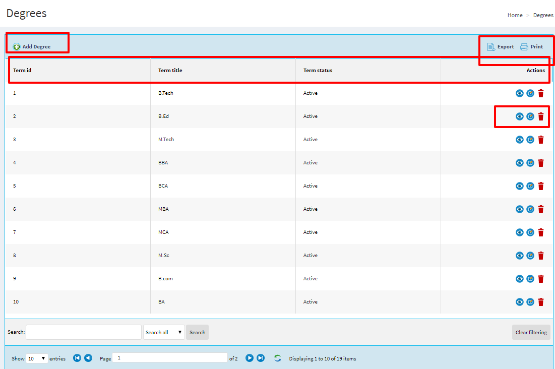 In options Administrator can list degrees by the way he can only add degree into the database.