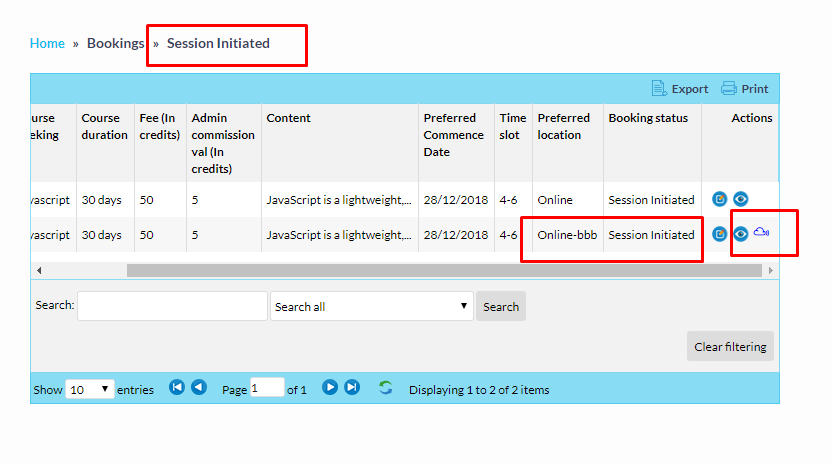 Once Tutor Initiated sessoin, BBB cloud icon enabled in bookings, Tutor can click on it start Virtual class.