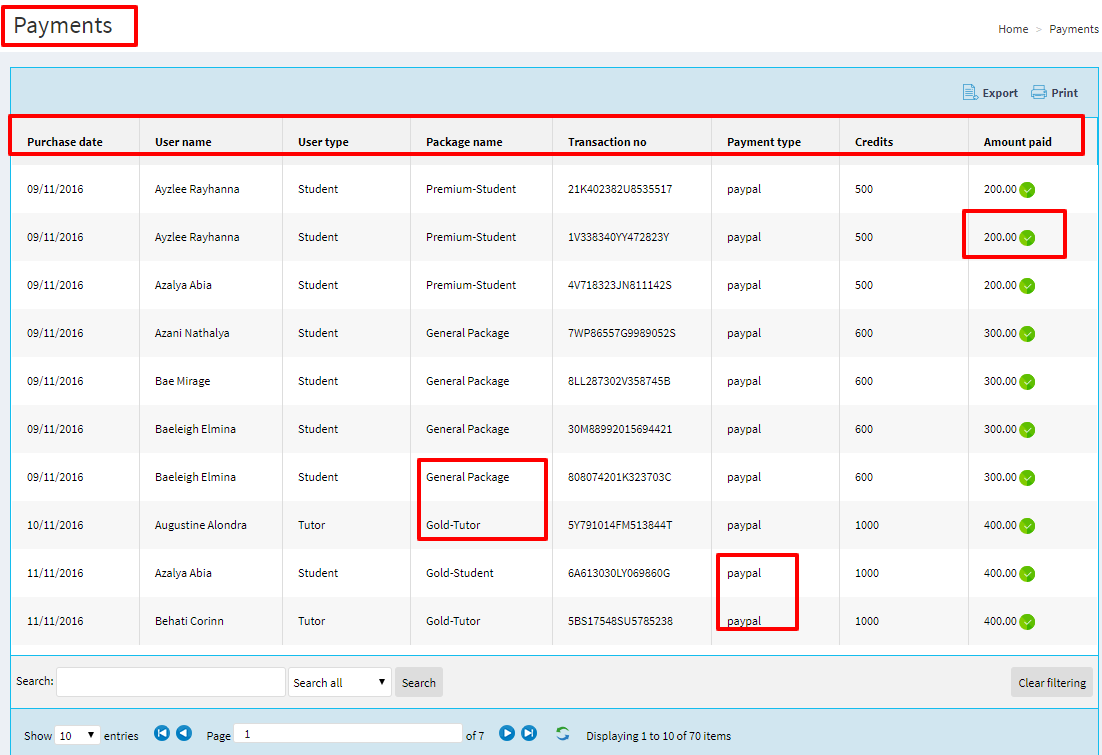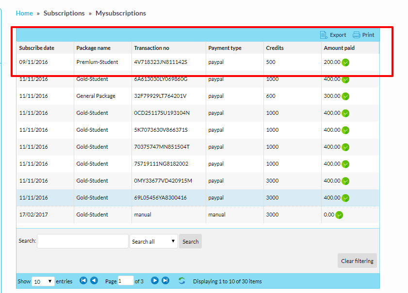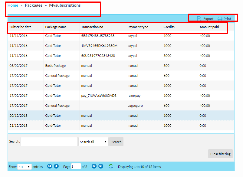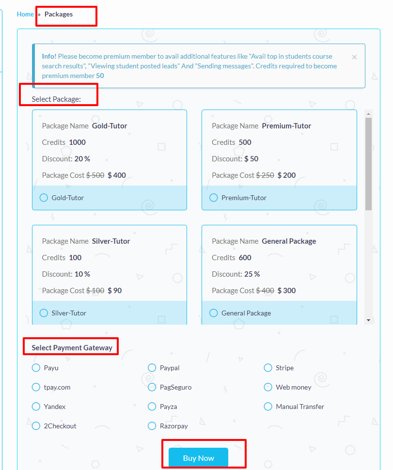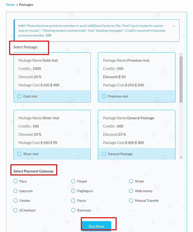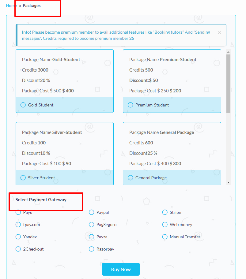 Package contains no of credits selling for particular institute or student or tutor.These credits can be used for different purposes.