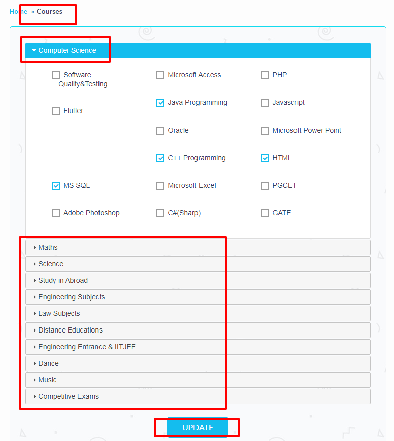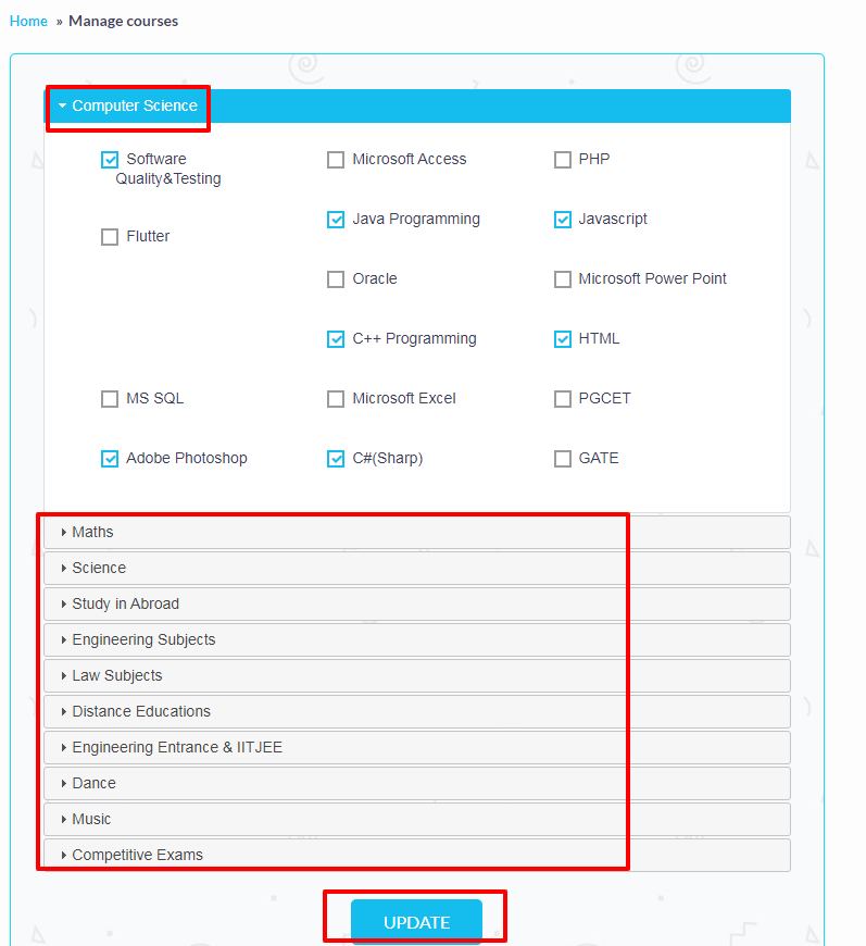 Admin can add courses by selecting catagories and slug given in the catagories list.
