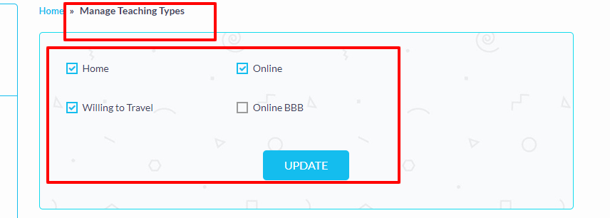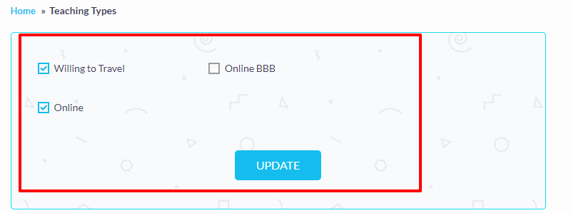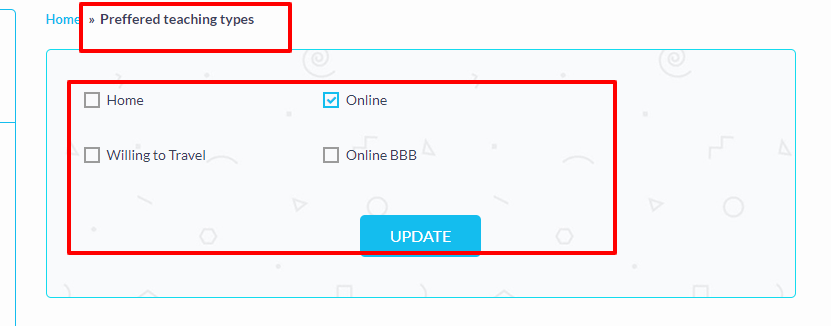 Tutor can set his preferred teaching types, which reflects at the time of student make booking.