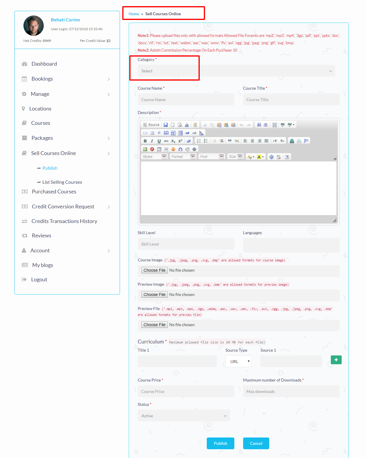 Tutor can select category of particular selling course when adding selling course.