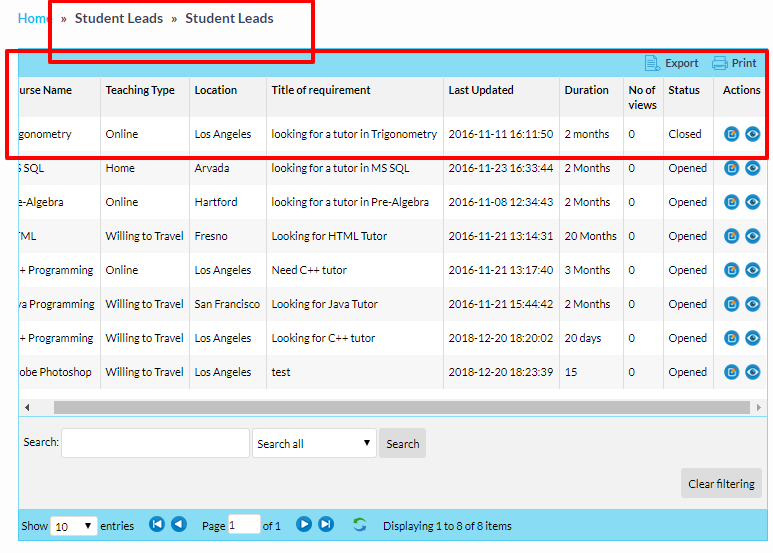 Leads are the Requirements posted by the Students.if Student needs particular course ,he will post on his dashboard by filling all the fields.so all these leads will be displayed in administrator dashboard.