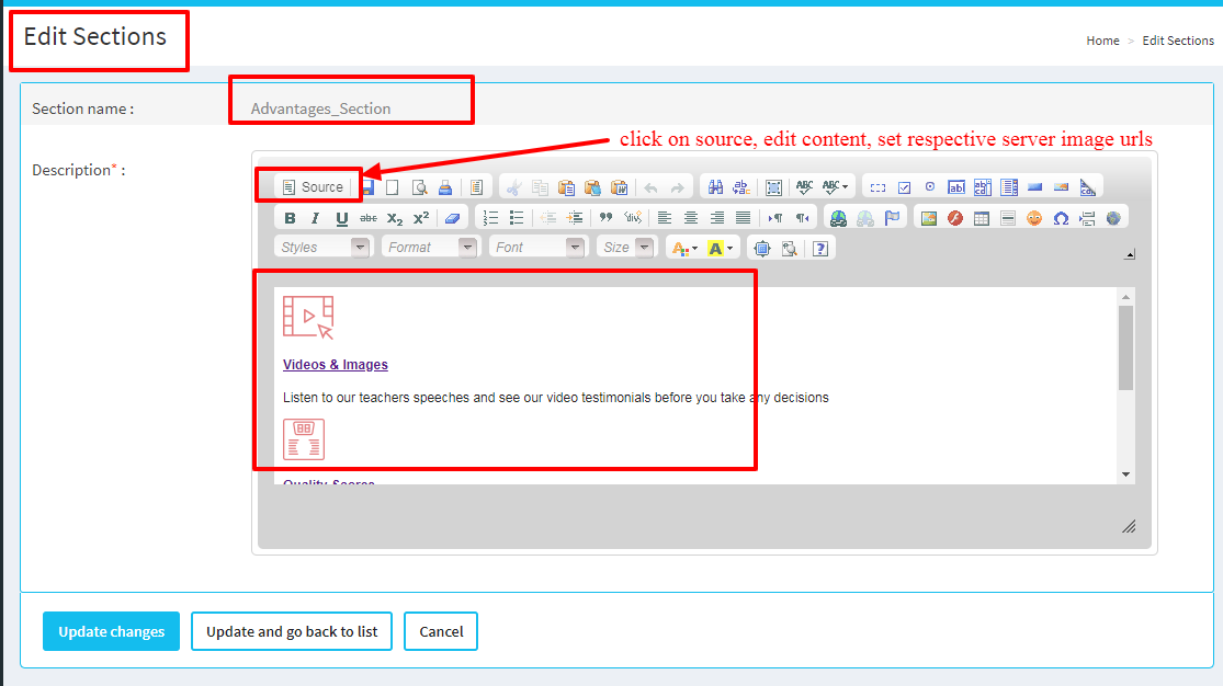 4. In that, in "description" field, click on the "source" which appears in the header of the textarea.